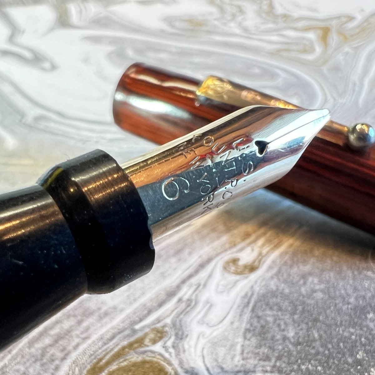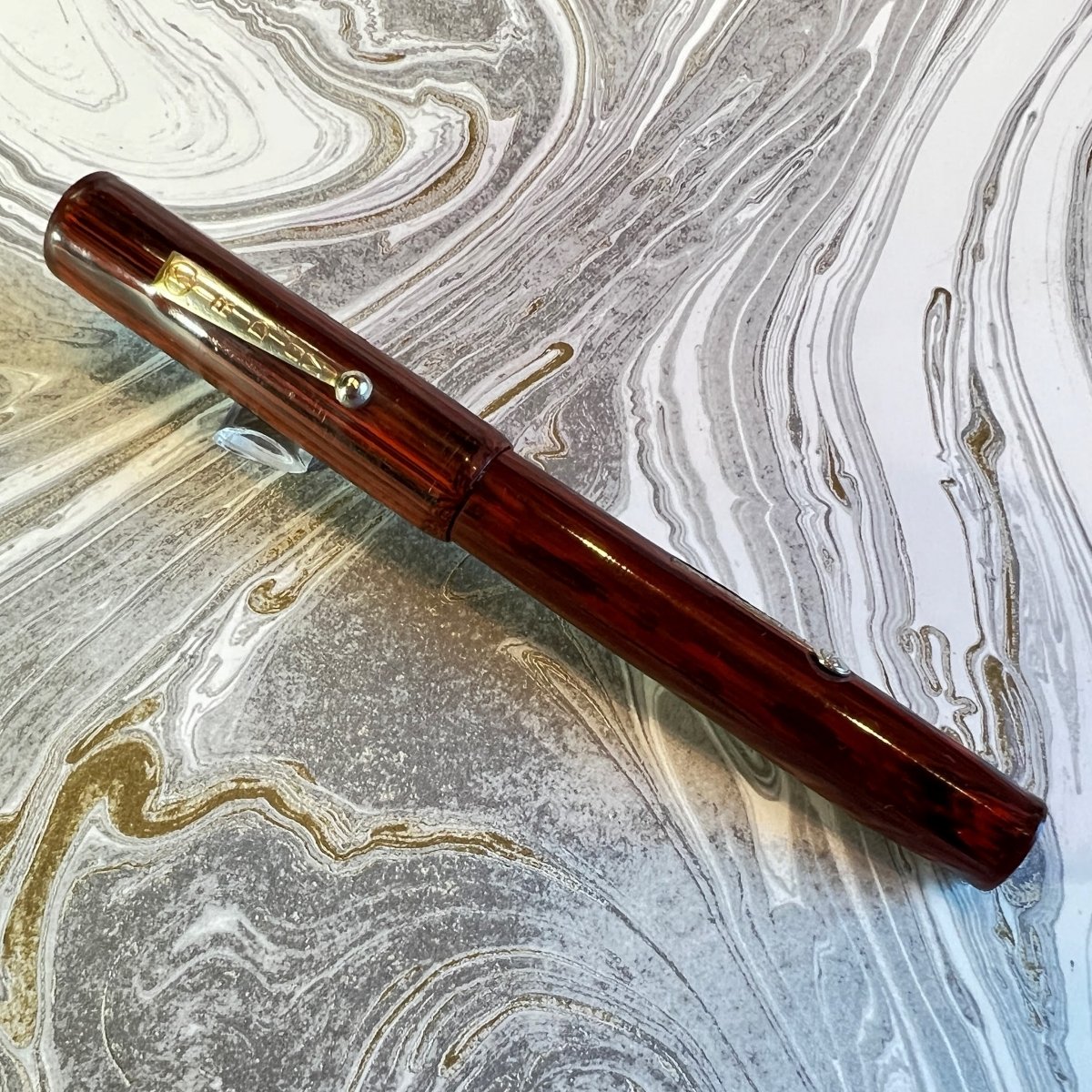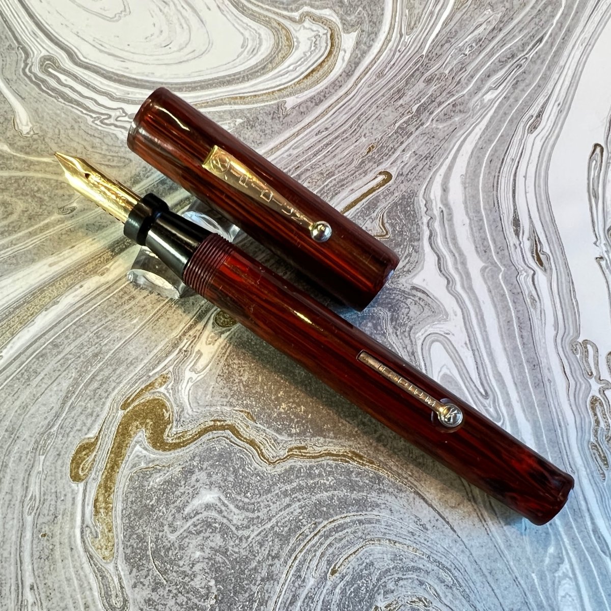 Additional Information: One deep scratch on barrel, but is nearly unnoticeable due to the colour which is a rich mahogany woodgrain. The nib is an original 14K U.S. Fountain Pen Co. #6, the tipping is worn away, but it writes a smooth medium.