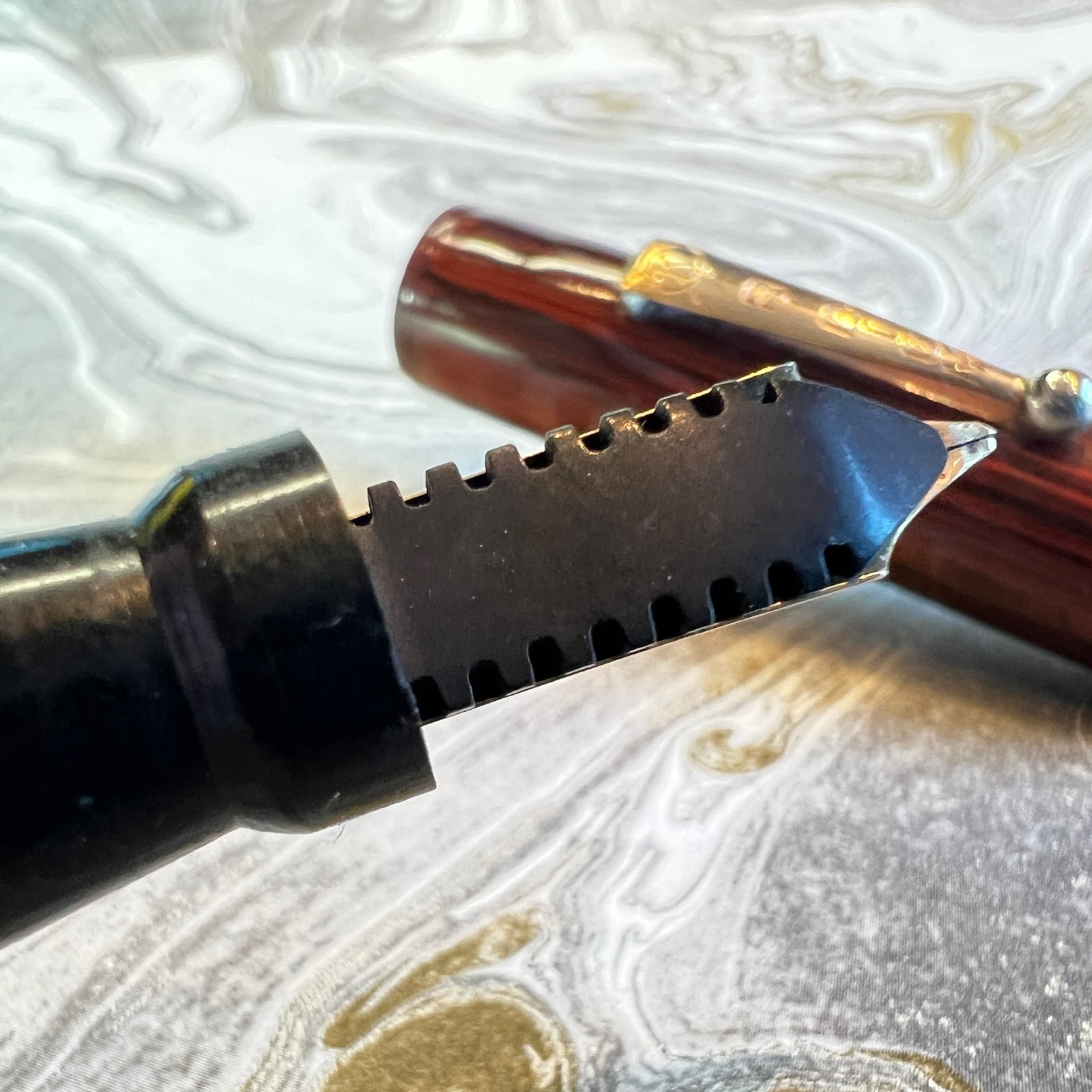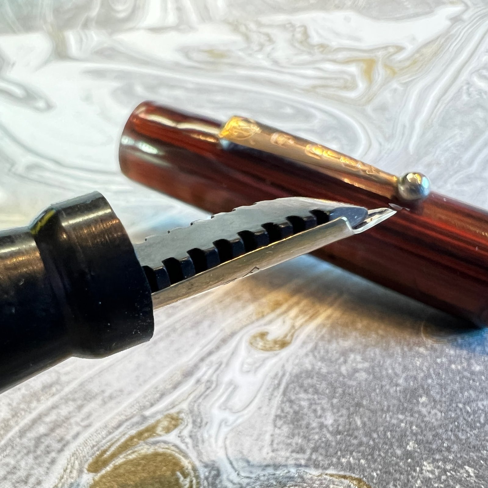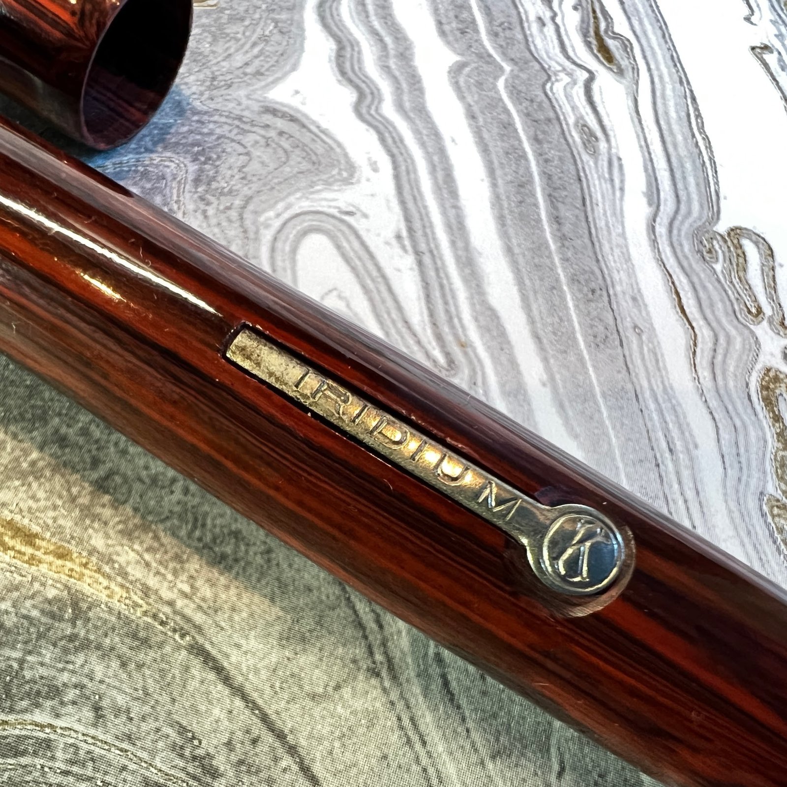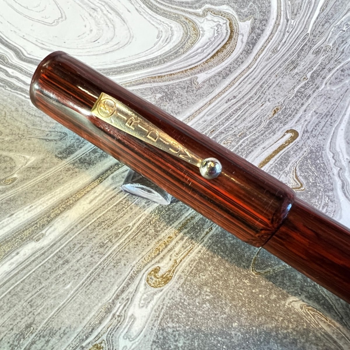 Additional Information: One deep scratch on barrel, but is nearly unnoticeable due to the colour which is a rich mahogany woodgrain. The nib is an original 14K U.S. Fountain Pen Co. #6, the tipping is worn away, but it writes a smooth medium.