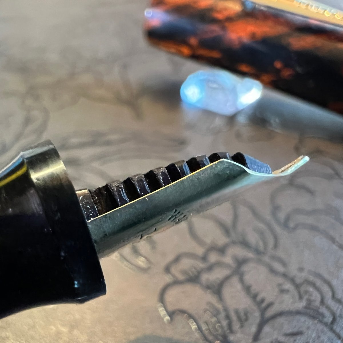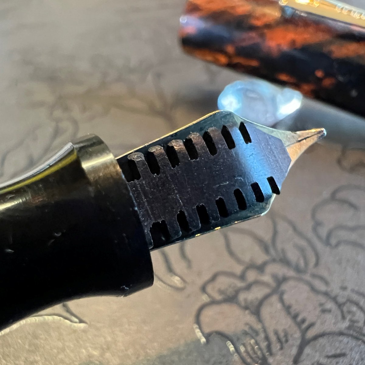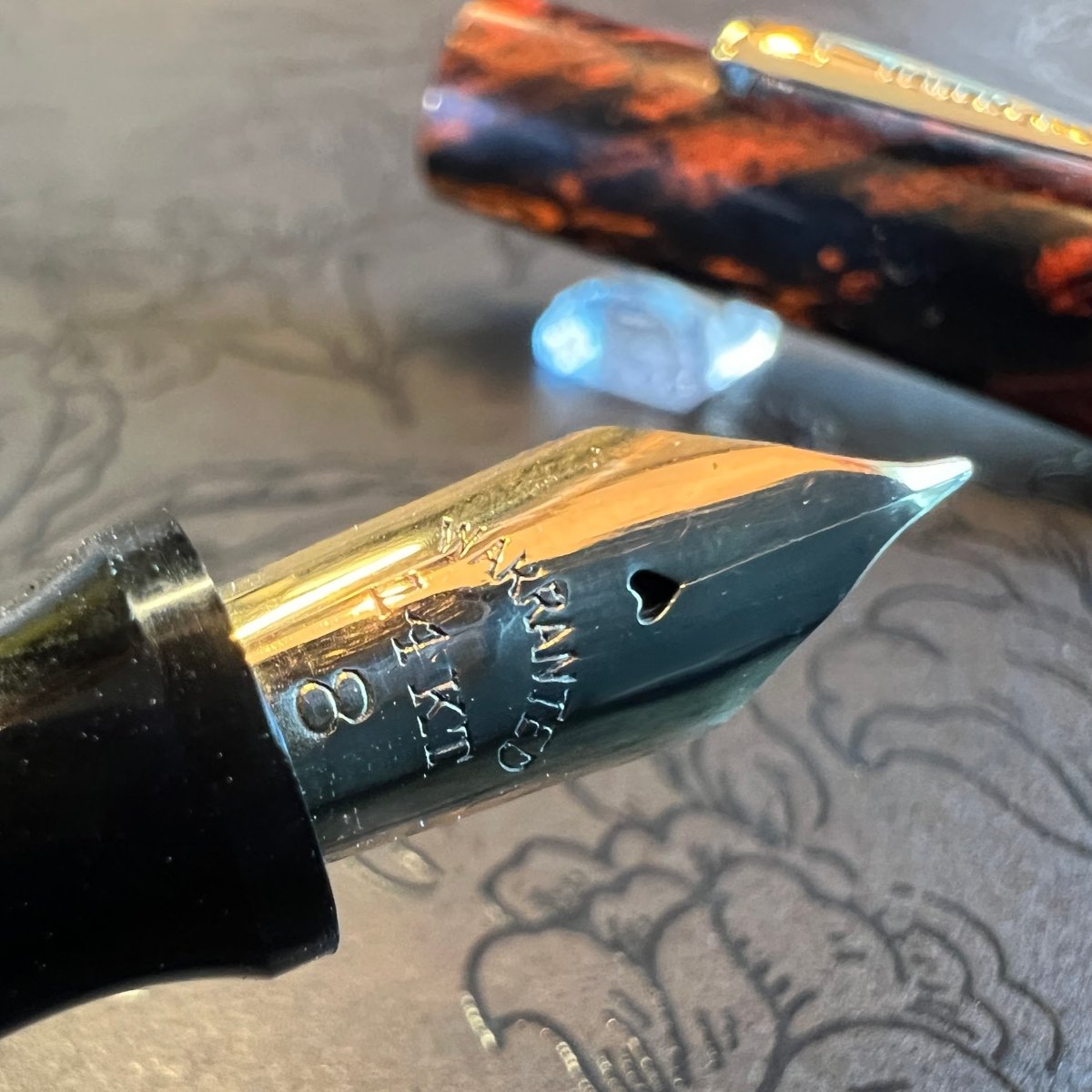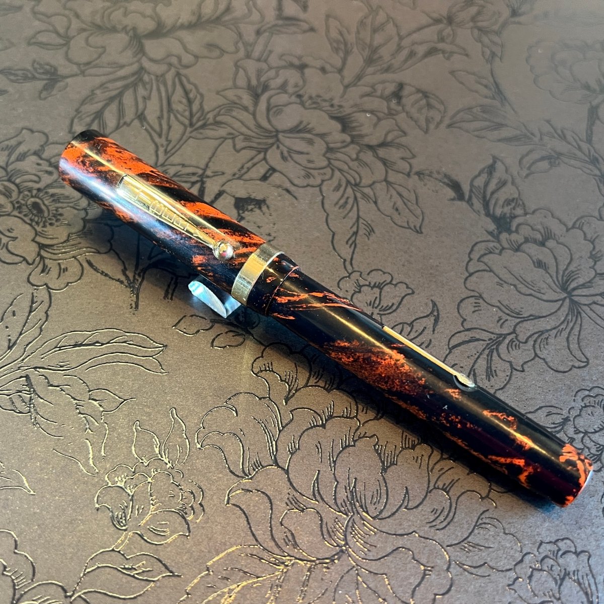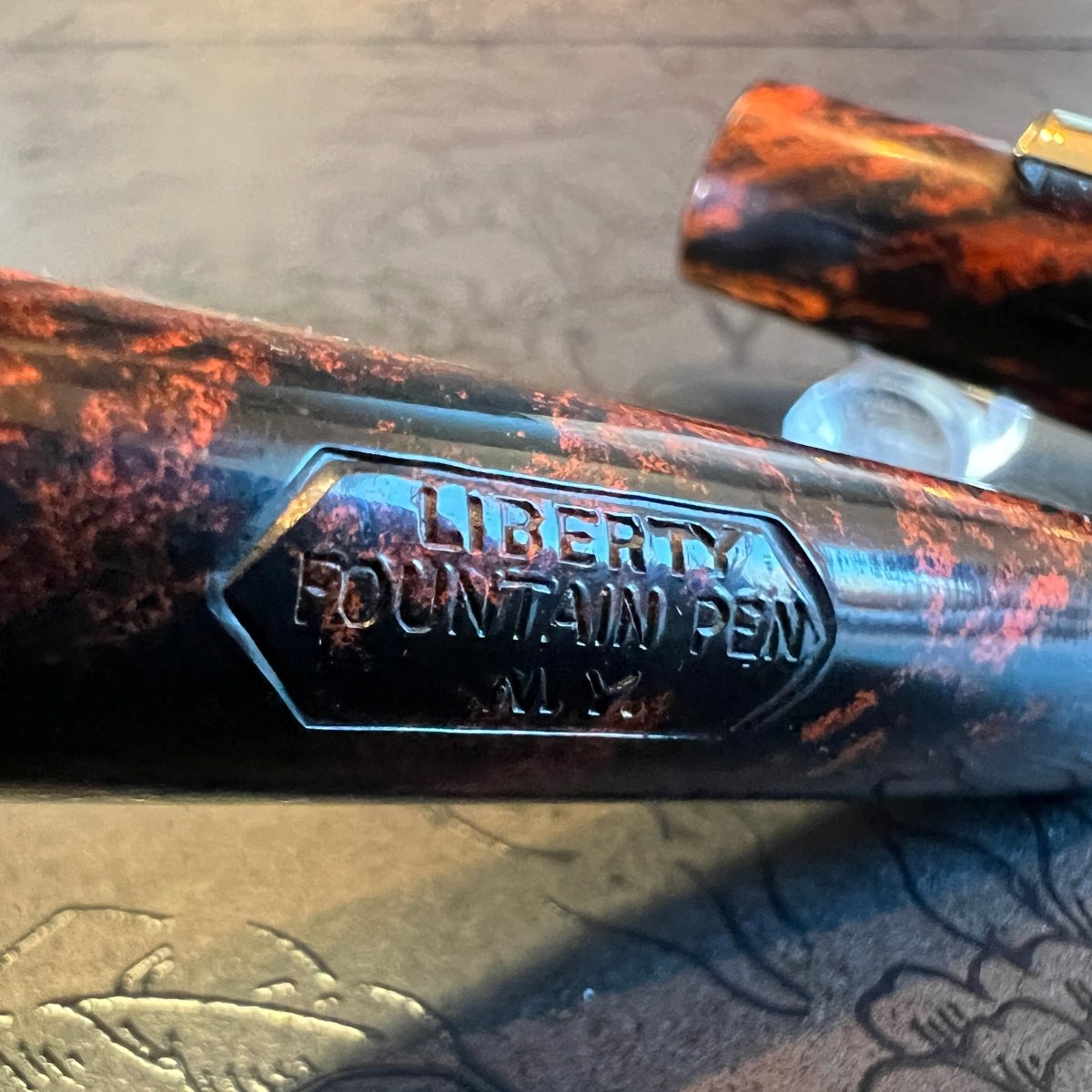 Additional Information: Liberty Fountain Pen Company, NYC; founded in early 1900’s and went out of business sometime around 1930. This appears to be a “deluxe” version of their mid tier pens. Although they were known for hard rubber, this appears to be a celluloid with broad gf cap band and no brassing. Really a stunning example of an early New York City pen!