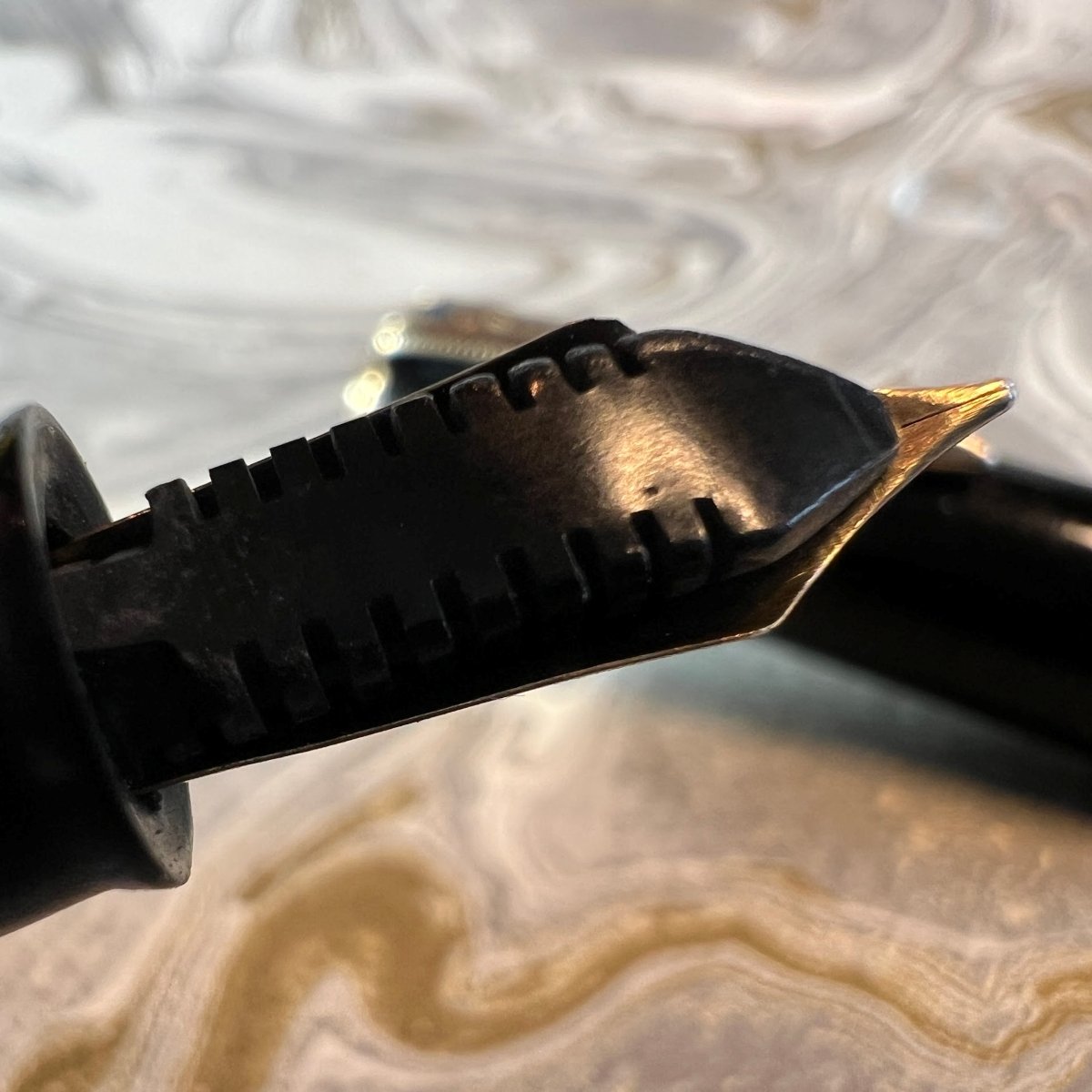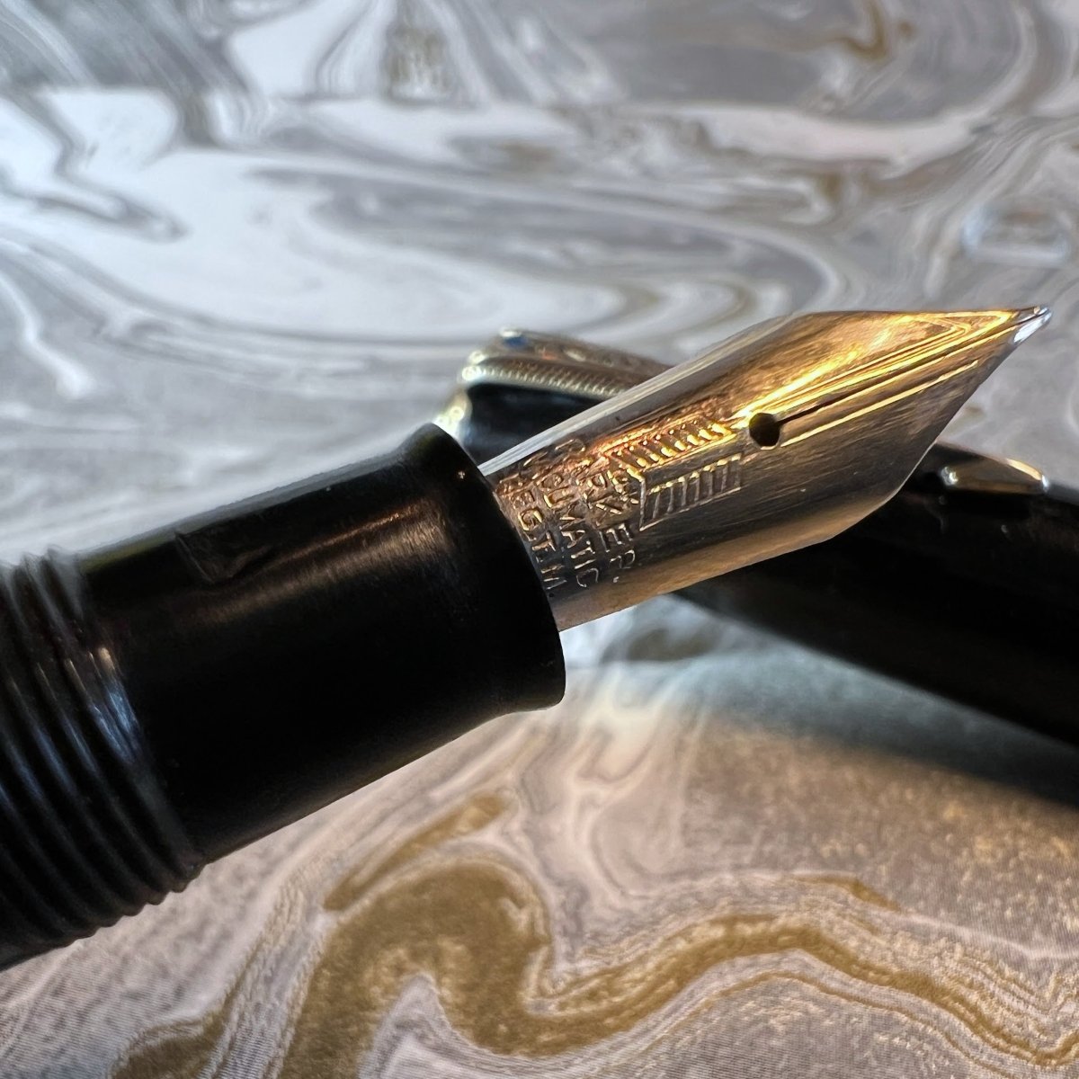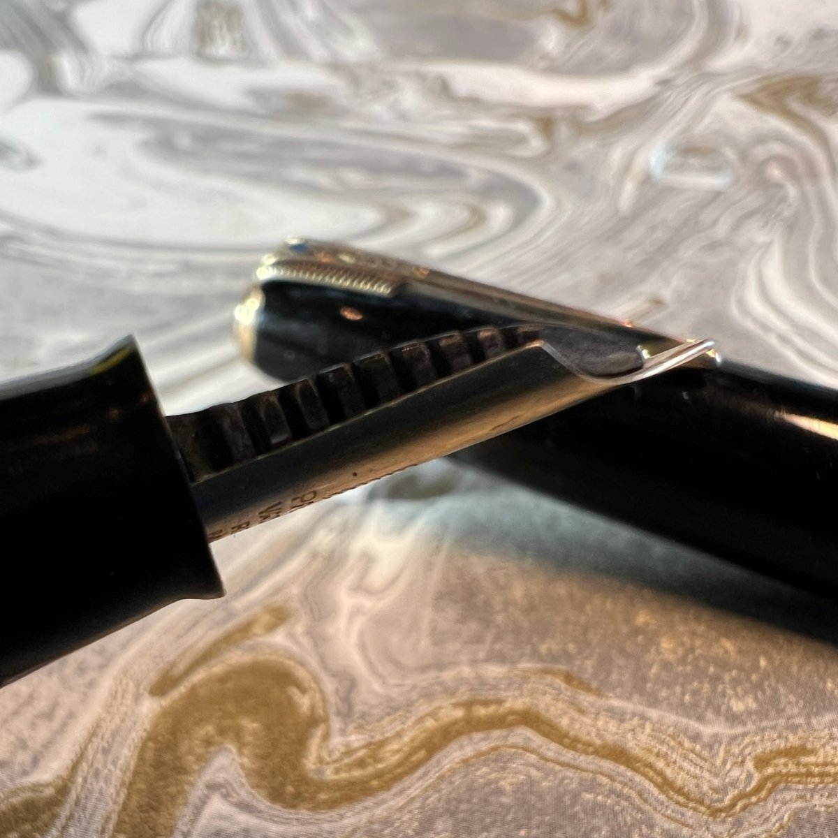 Additional Information: No brassing, Smooth Black, weak imprint. Beautiful 14K flex nib. Wide chevron band This is a very nice edc pen!