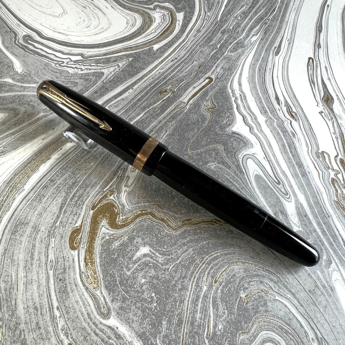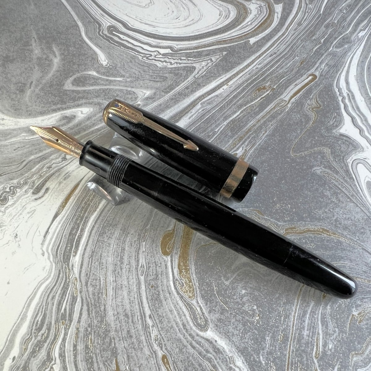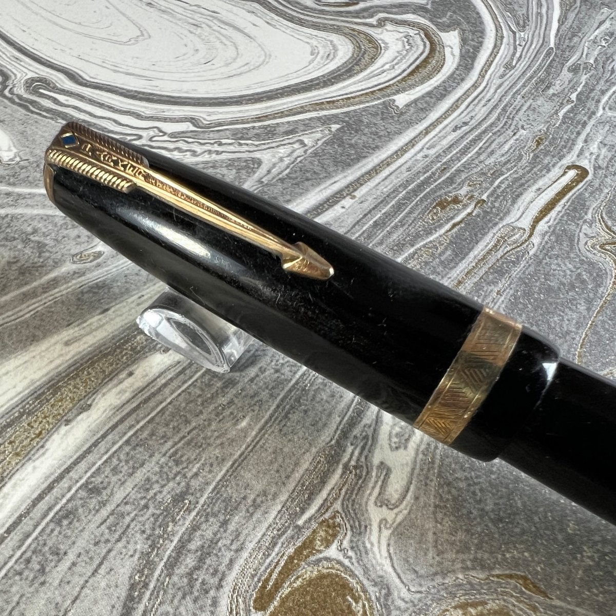 Additional Information: No brassing, Smooth Black, weak imprint. Beautiful 14K flex nib. Wide chevron band This is a very nice edc pen!
