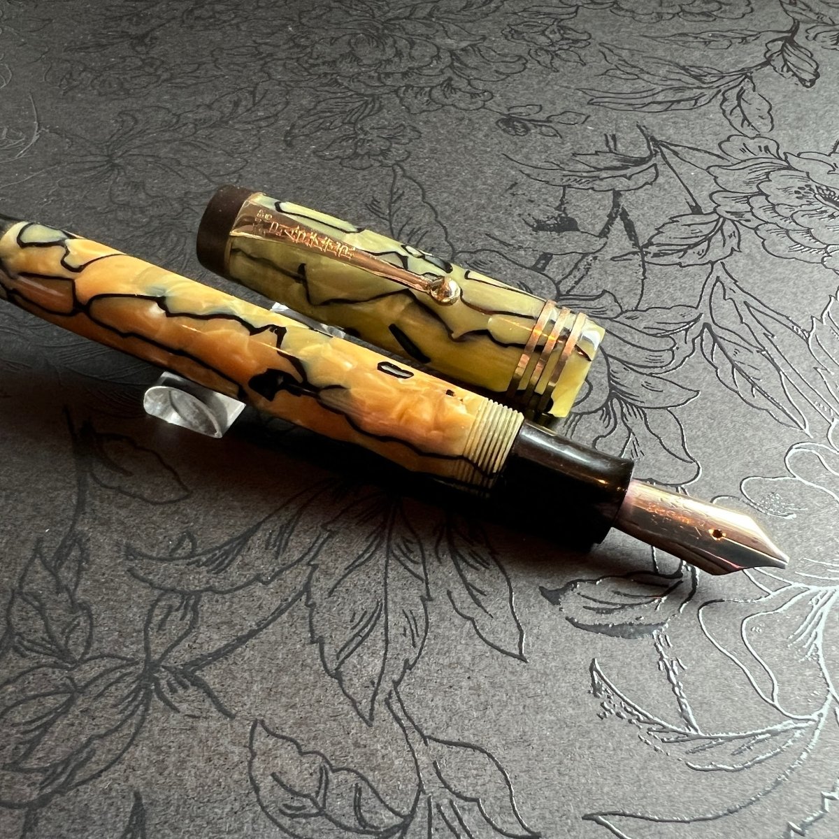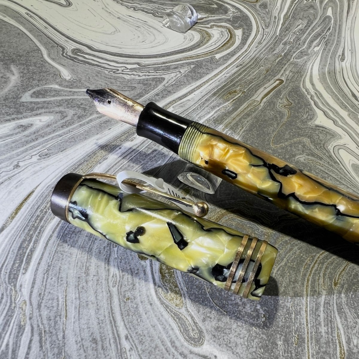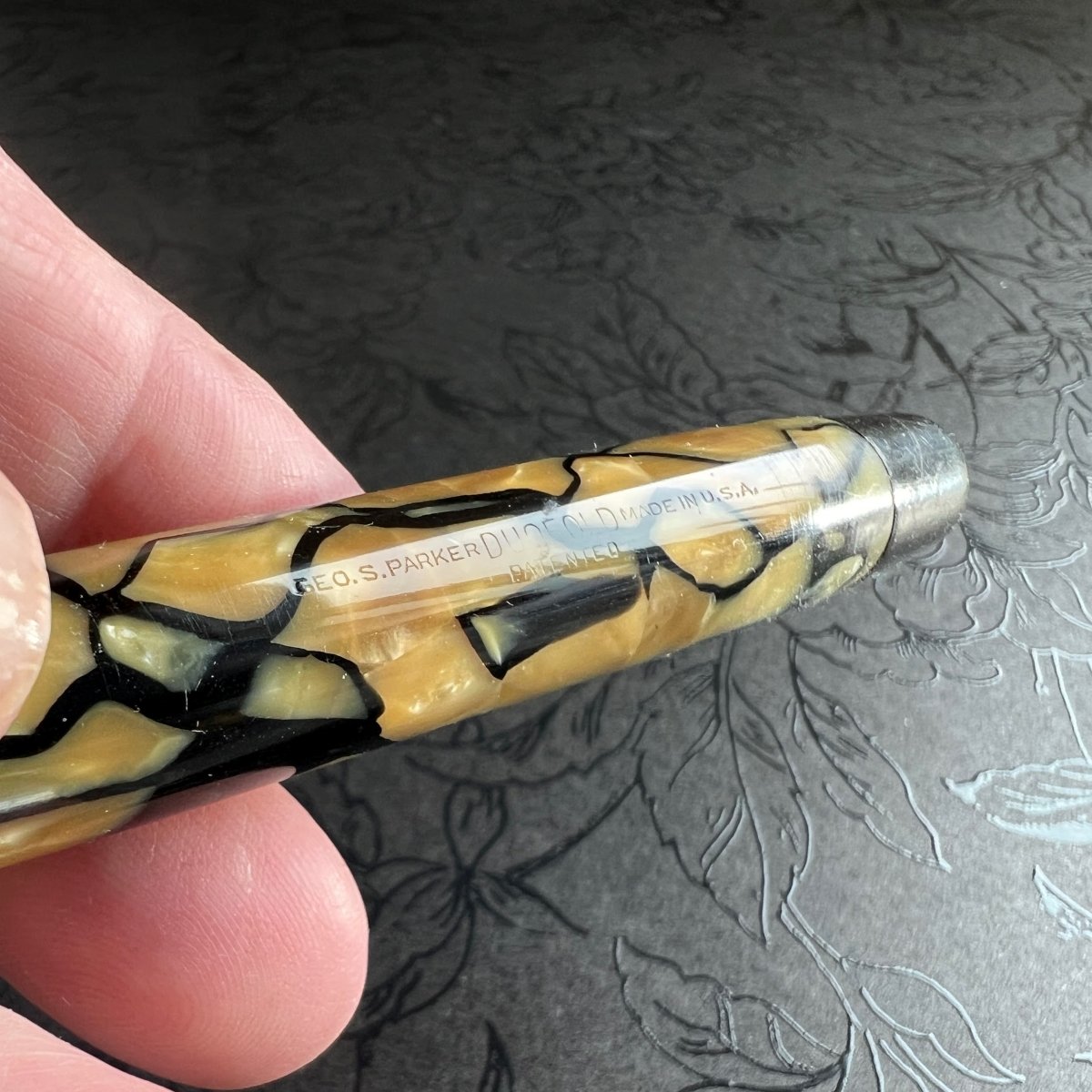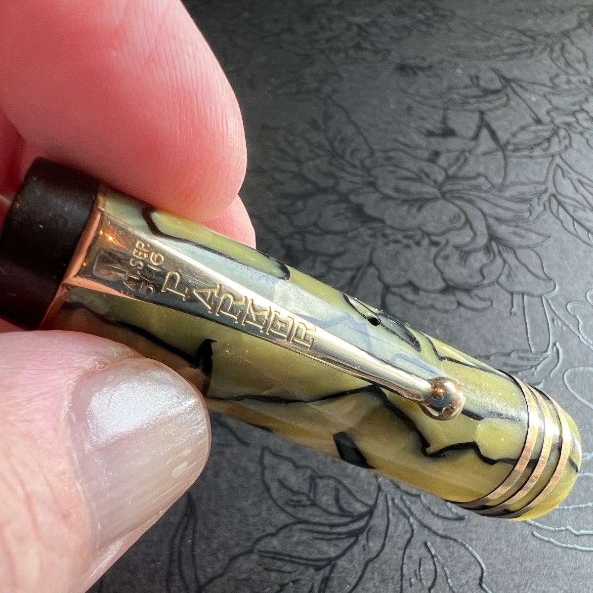 Additional Information: Streamline button filler with a truly outstanding nib. This one will make your grand signature look truly impressive. Fitted with a 100% silicone sac to prevent leaching and darkening of the barrel. Minor darkening to the barrel and slight brassing on the pocket clip ball. One of the great things about these pens is that, with the addition of a taper and a pen stand, it becomes a stunning desk pen. One of the brilliant features of vintage Parker pens!