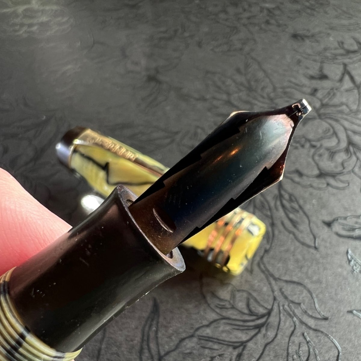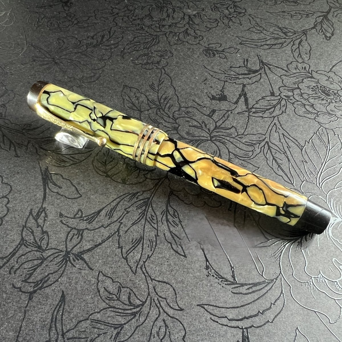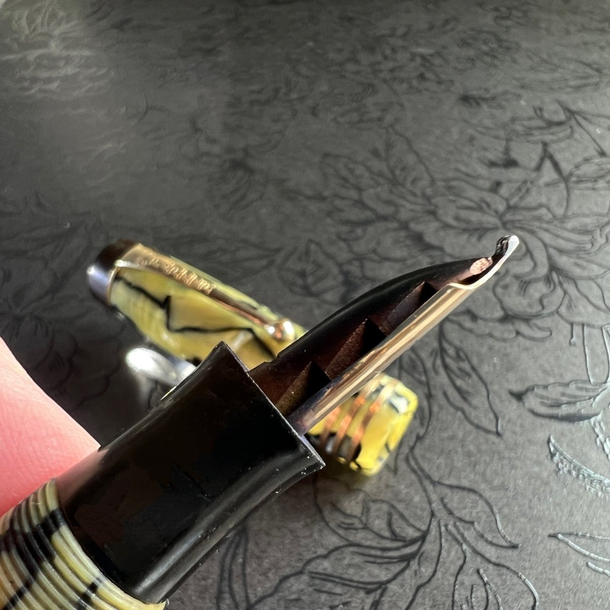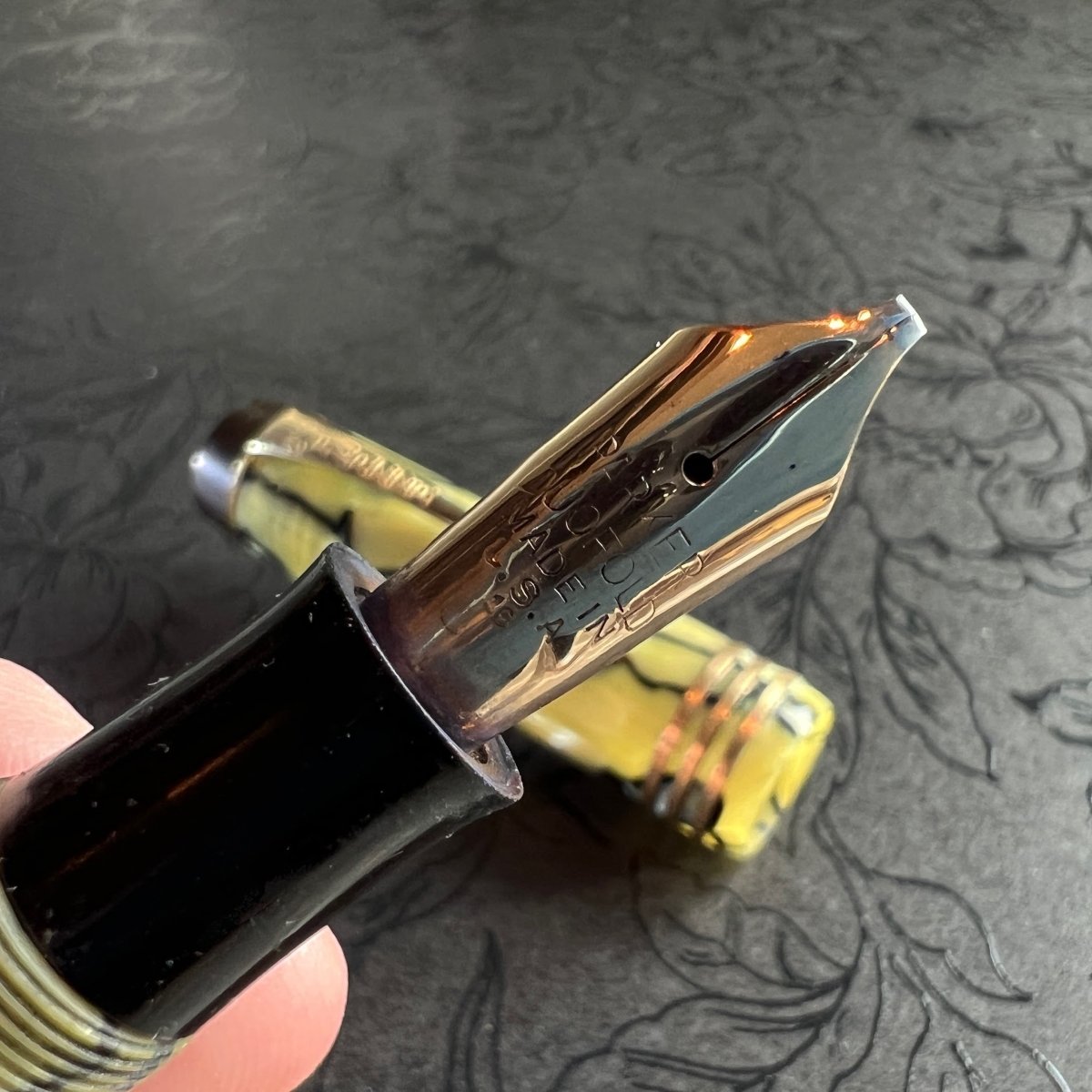 Additional Information: Streamline button filler with a truly outstanding nib. This one will make your grand signature look truly impressive. Fitted with a 100% silicone sac to prevent leaching and darkening of the barrel. Minor darkening to the barrel and slight brassing on the pocket clip ball. One of the great things about these pens is that, with the addition of a taper and a pen stand, it becomes a stunning desk pen. One of the brilliant features of vintage Parker pens!