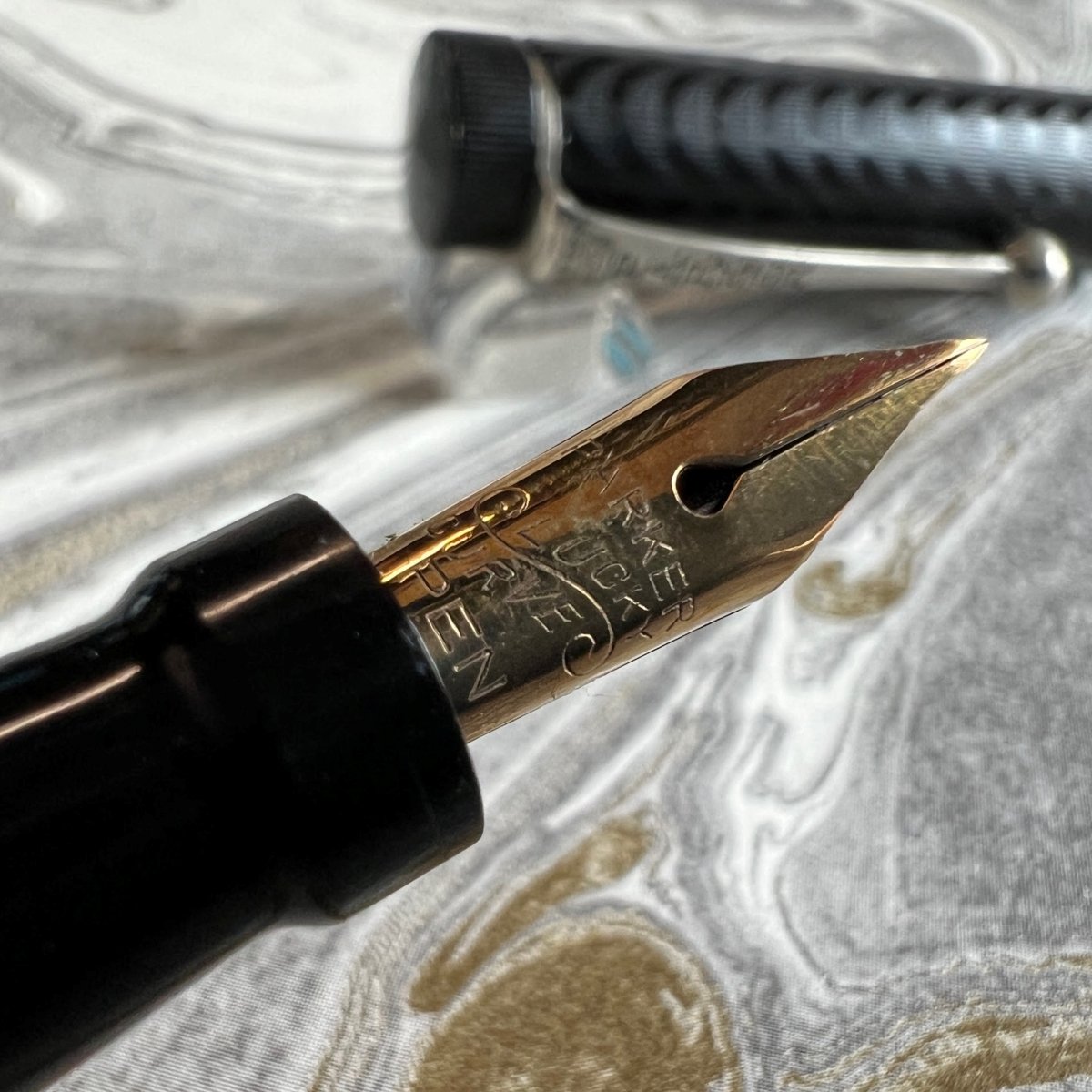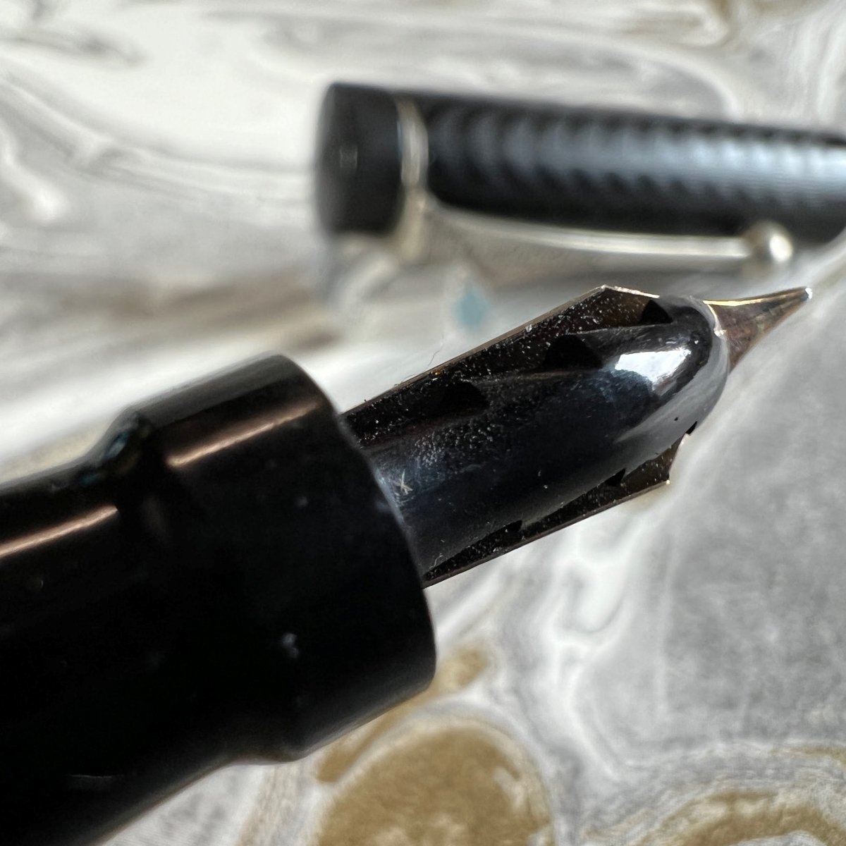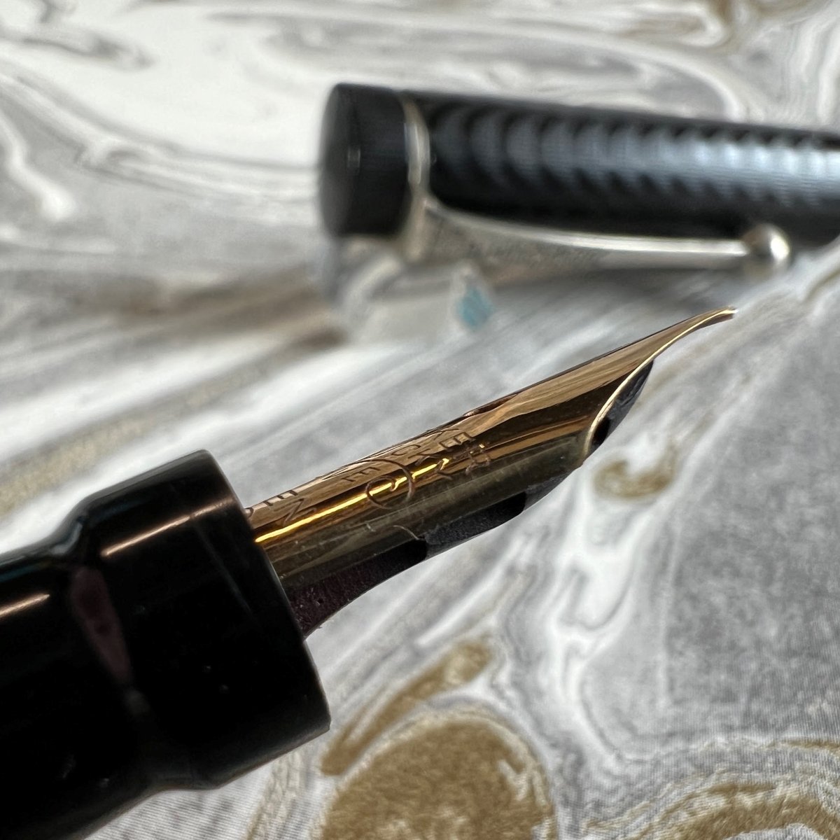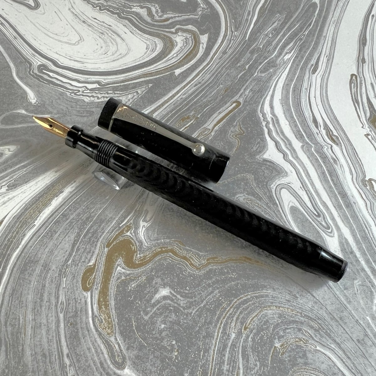 Additional Information: Excellent chasing, c/w the nickel clip which was made available in 1916 for an extra 25c. Imprints are crisp, colour is perfect, and sports a 14K flexible Lucky Curve nib, intact Lucky Curve feed. True collectors pen!