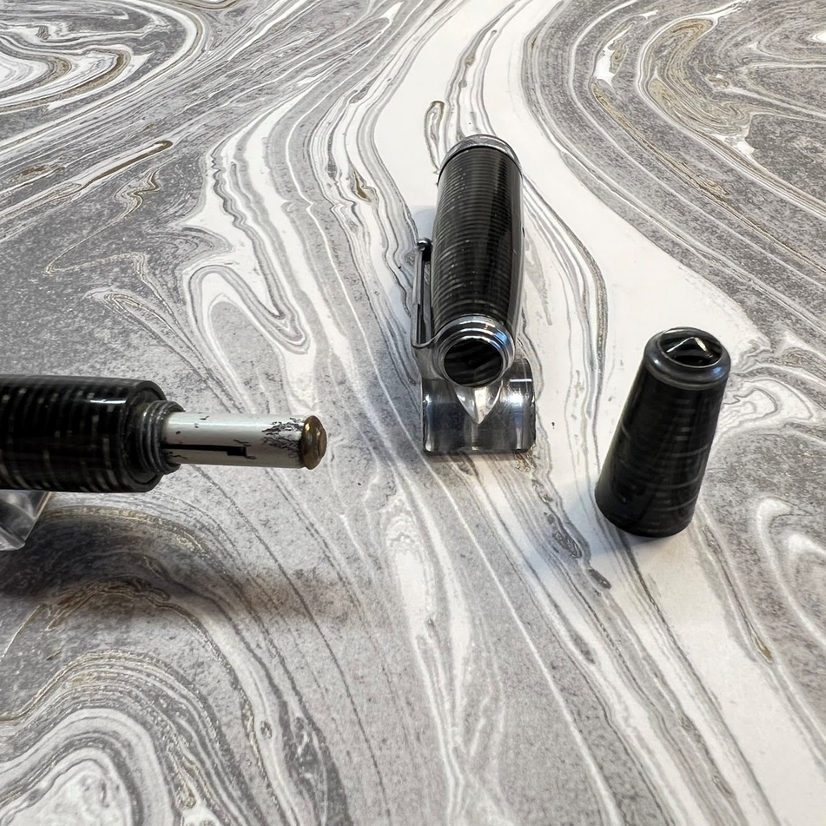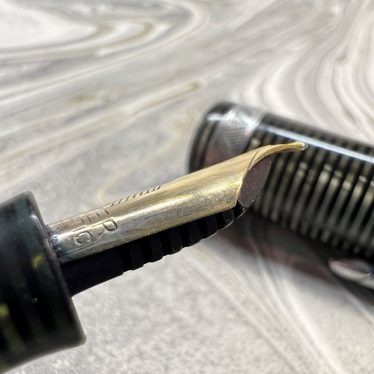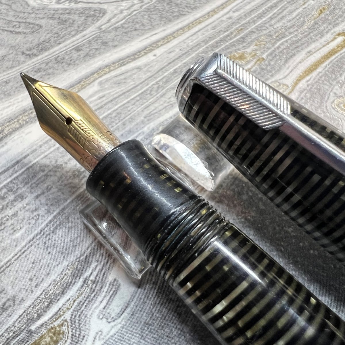 Additional Information: Near perfect clarity, the 14k two tone nib has lost most of it’s rhodium plate and is a lovely medium flex.  Aluminum speedline filler, jeweller’s band. No plating loss.