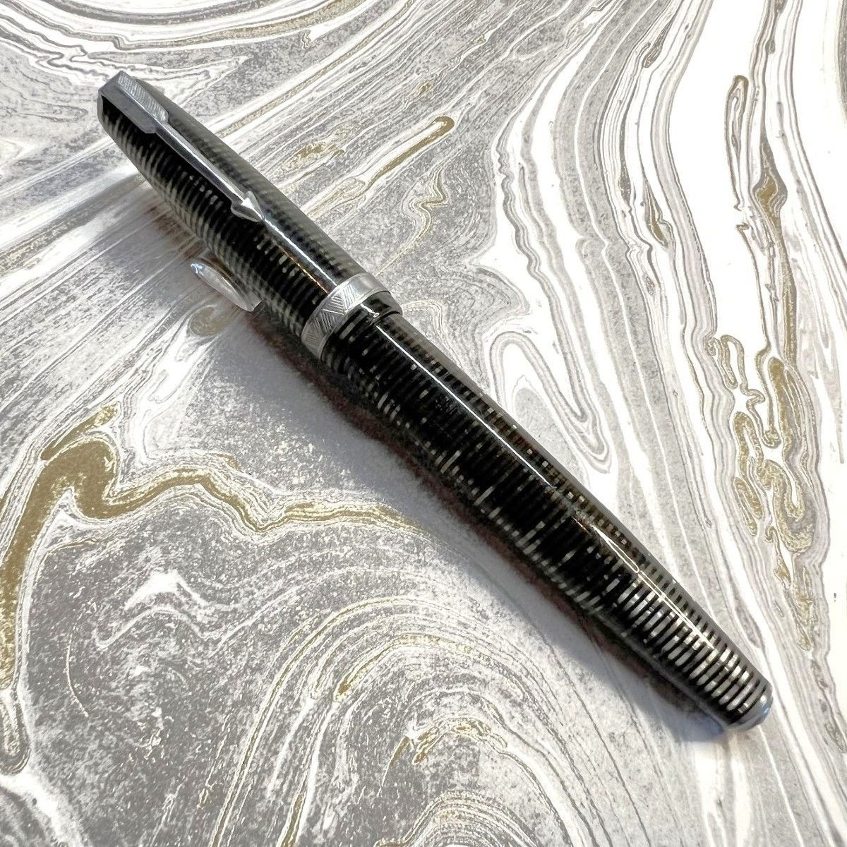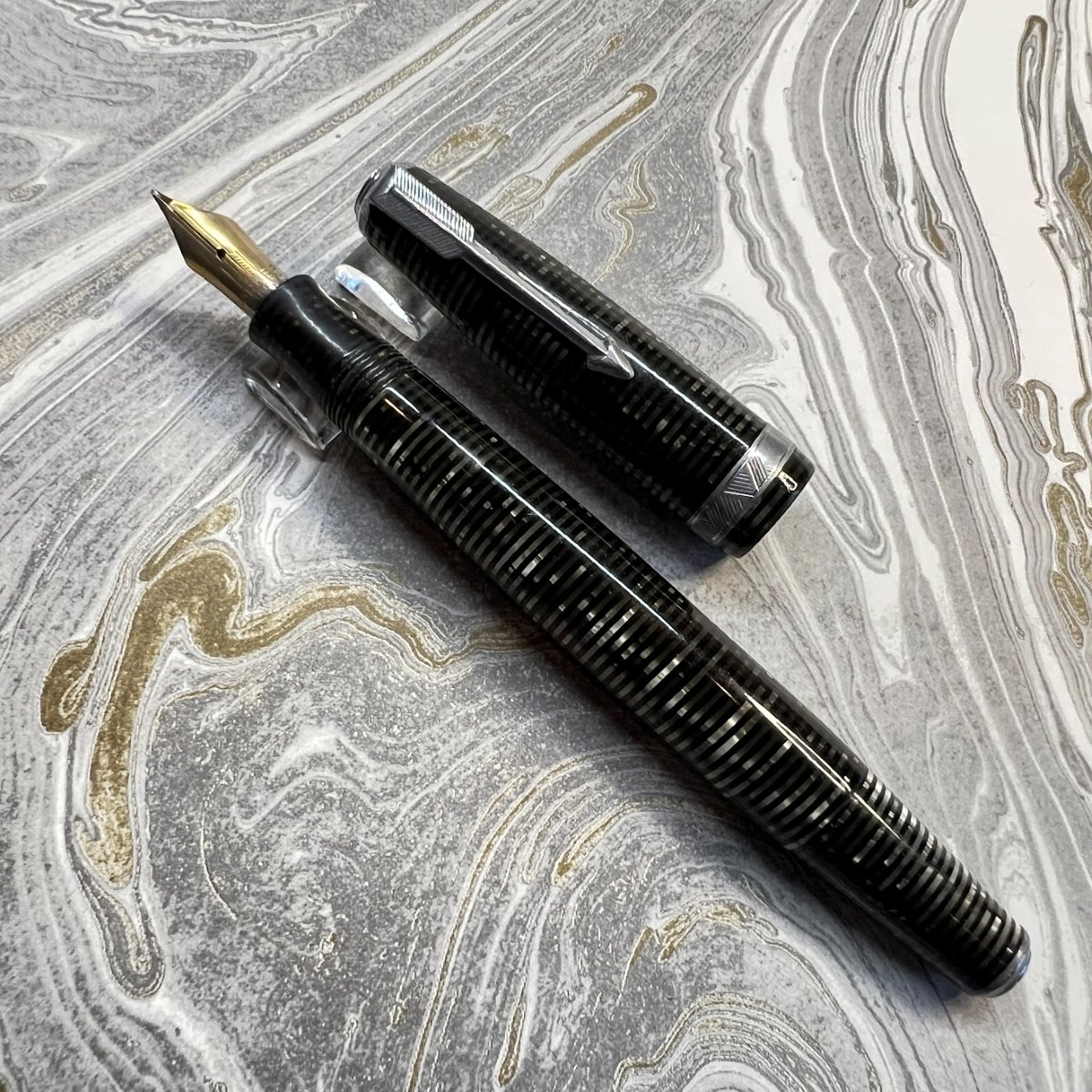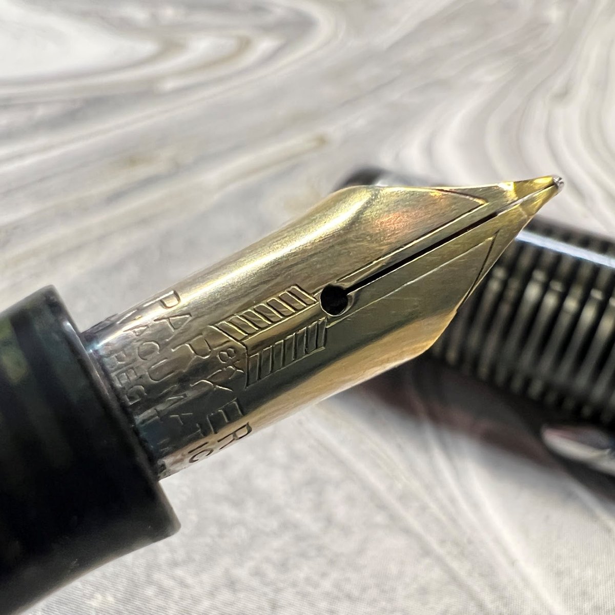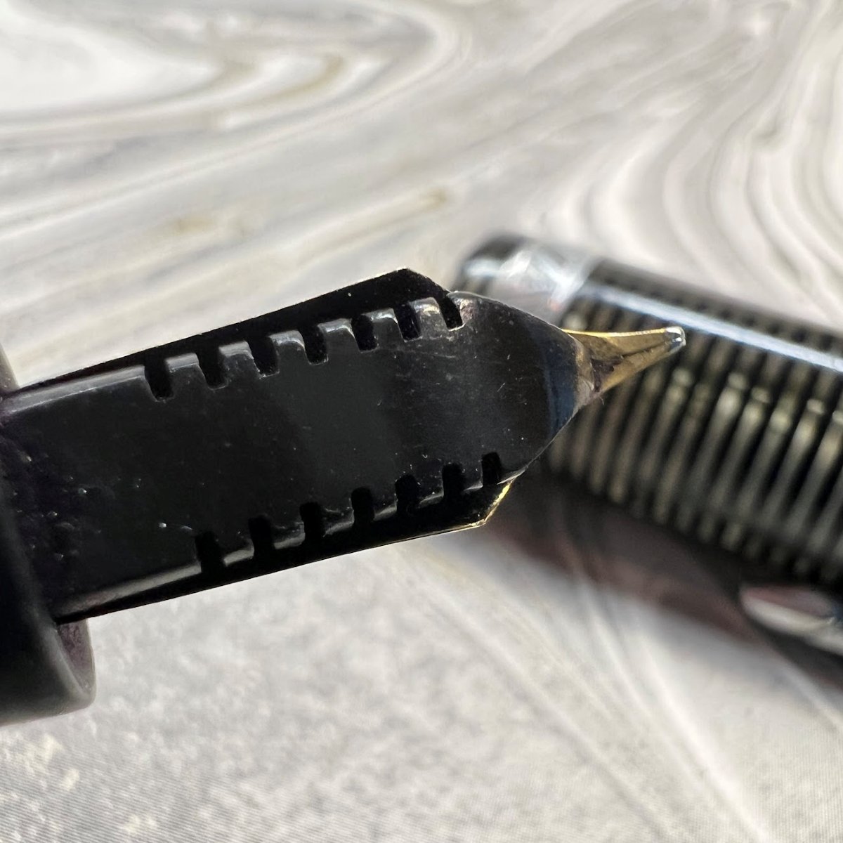 Additional Information: Near perfect clarity, the 14k two tone nib has lost most of it’s rhodium plate and is a lovely medium flex.  Aluminum speedline filler, jeweller’s band. No plating loss.