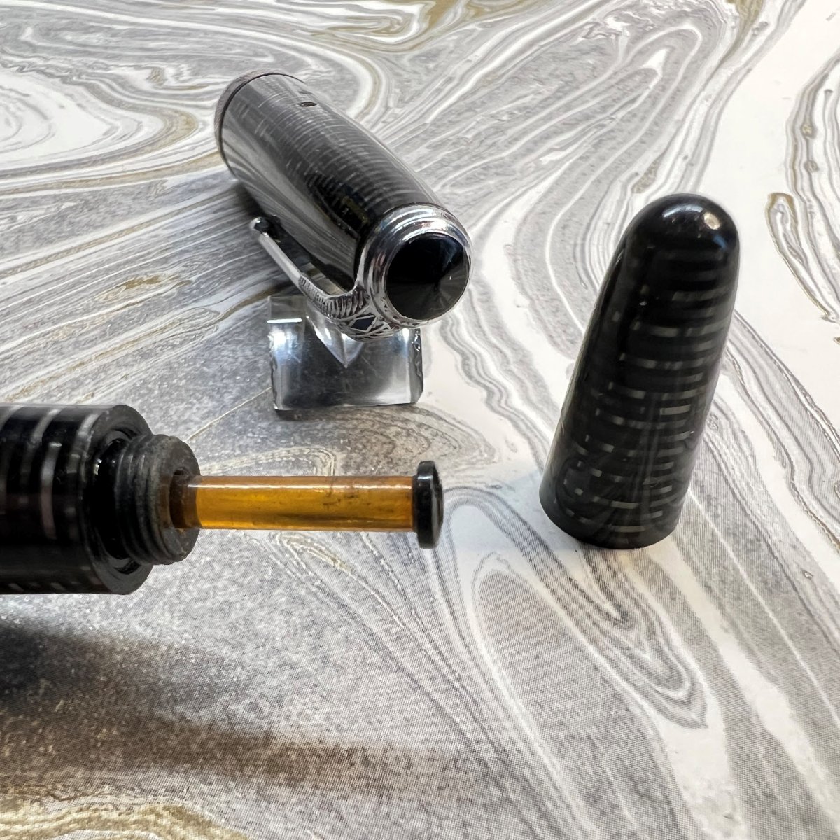Additional Information: Moderate Amber, some plating loss on jeweller’s band, Two Tone flexible nib. Ink level is visible. Very nice, good sized pen.