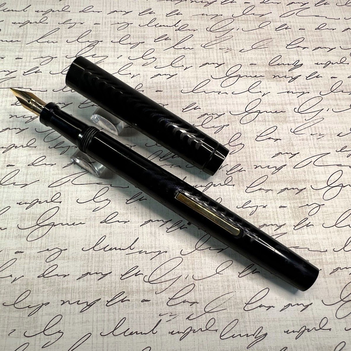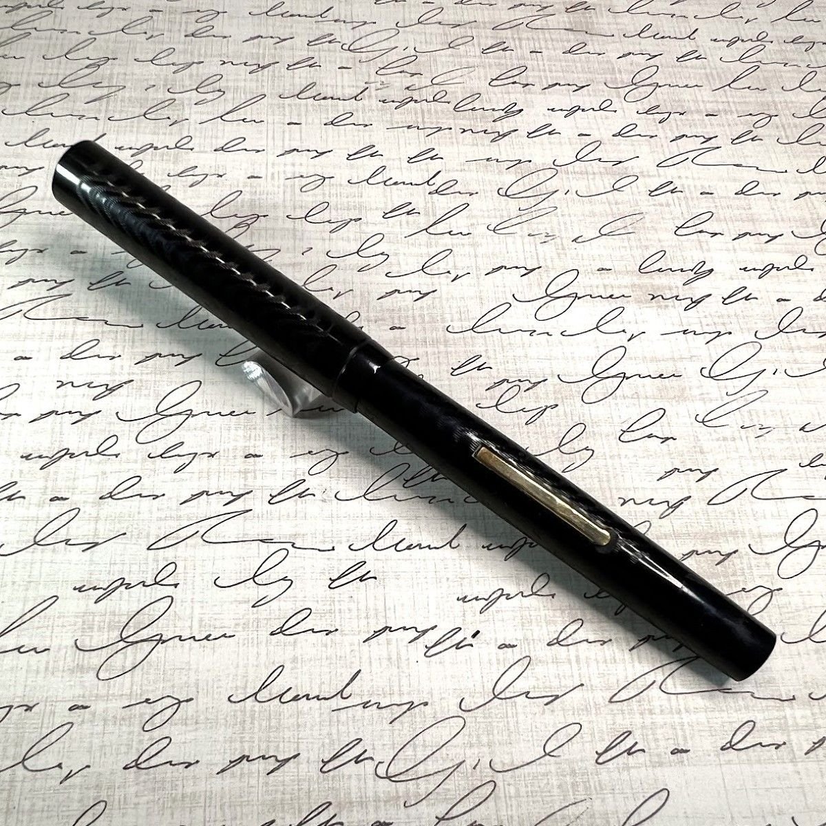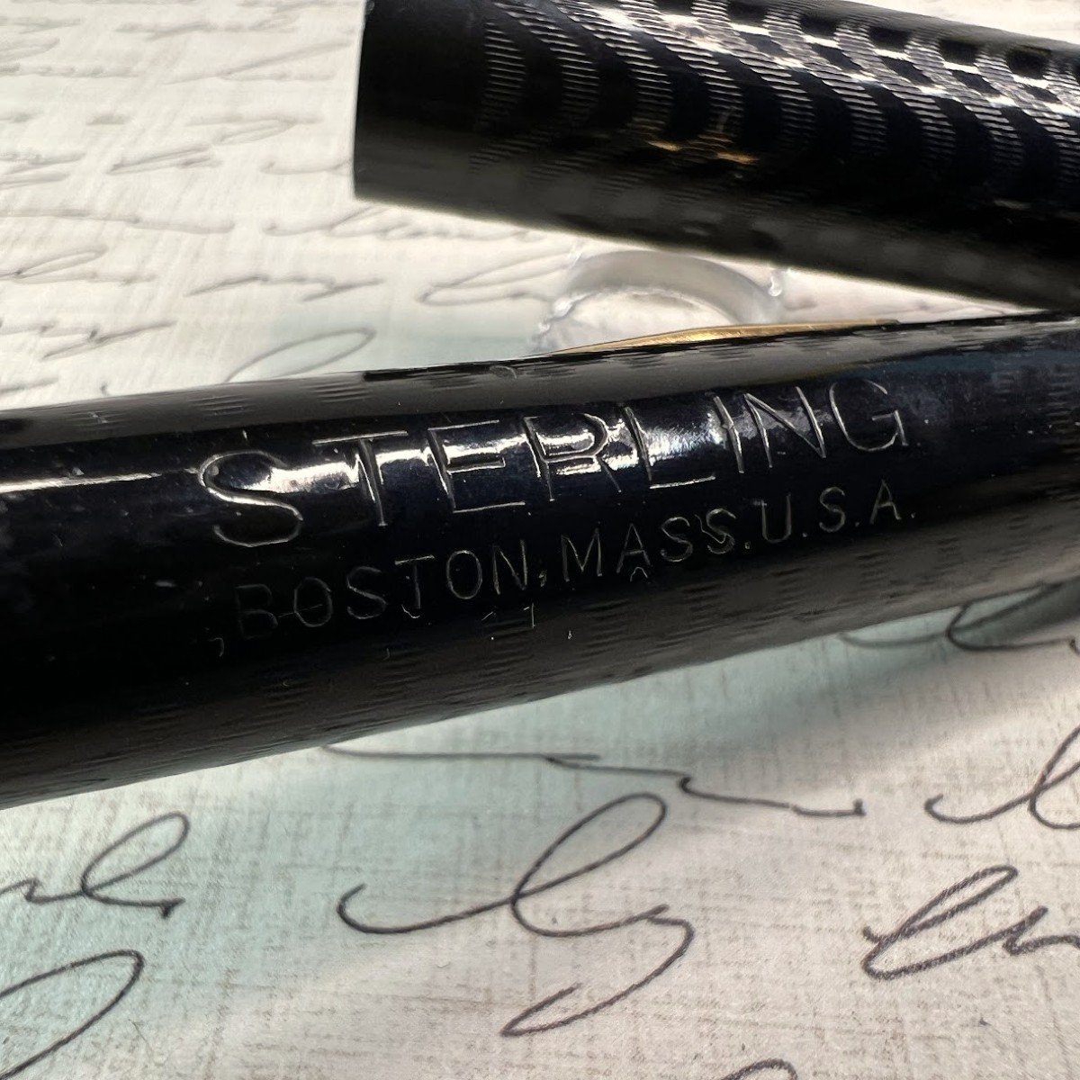 Additional Information: Glossy and crisp, this pen shows no signs of use. At least 100 years old! clipless, and accommodation clips are available. “Sterling Fountain Pen Company (was a) pen manufacturing company located in Boston, Massachusetts; founded in 1901 by the Davidson Rubber Company. Using brand names such as The Hub Fountain Pen, Sterling produced hard rubber pens like the eyedropper-filling model illustrated at middle joint; some models also appeared with overlays. The company was divested in 1919 to Francis A. Harrigan, a Boston attorney, who relocated production within the city and continued to produce pens until the mid-1920s.”(courtesy of Richard Binder Richardspens.com)