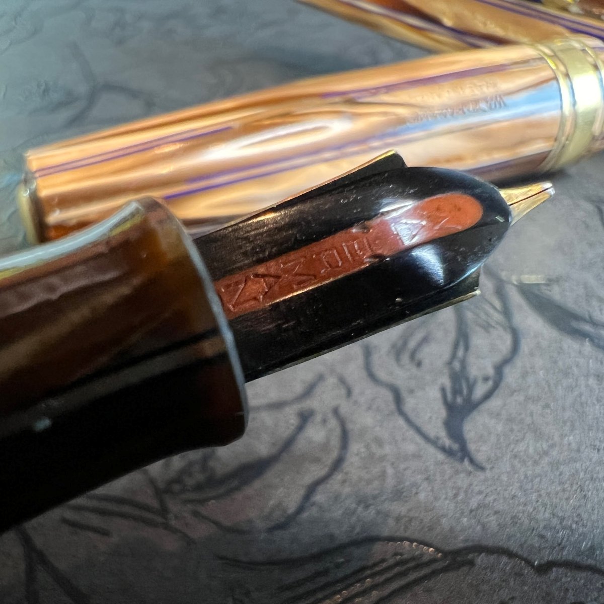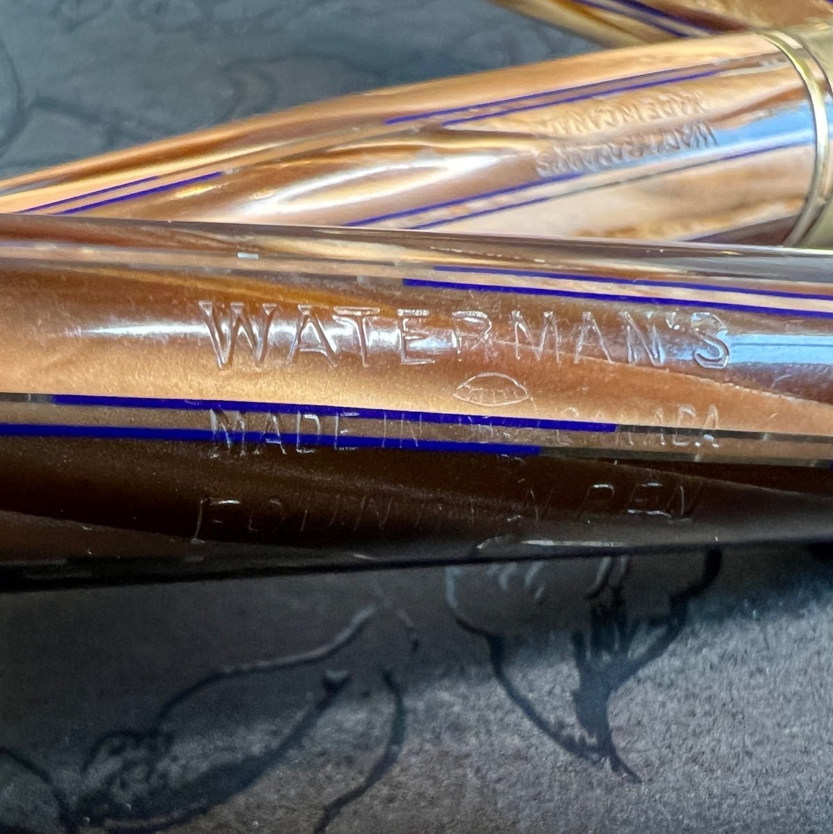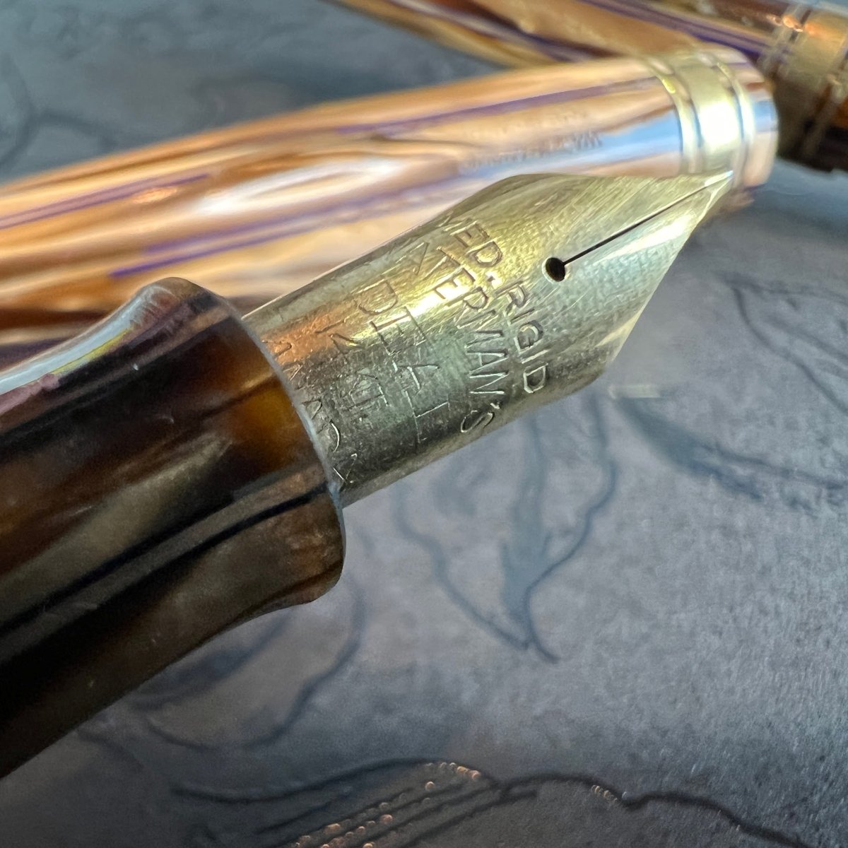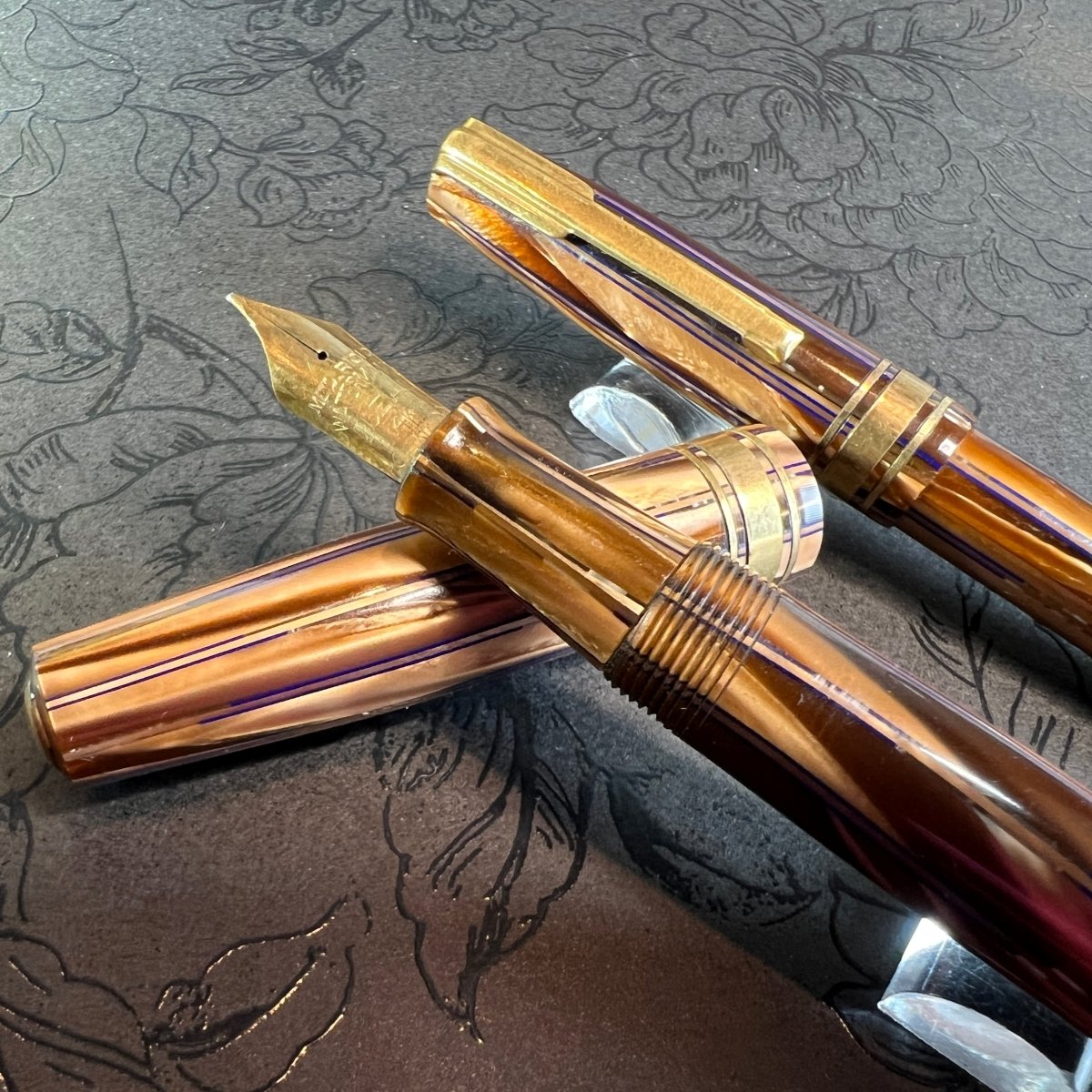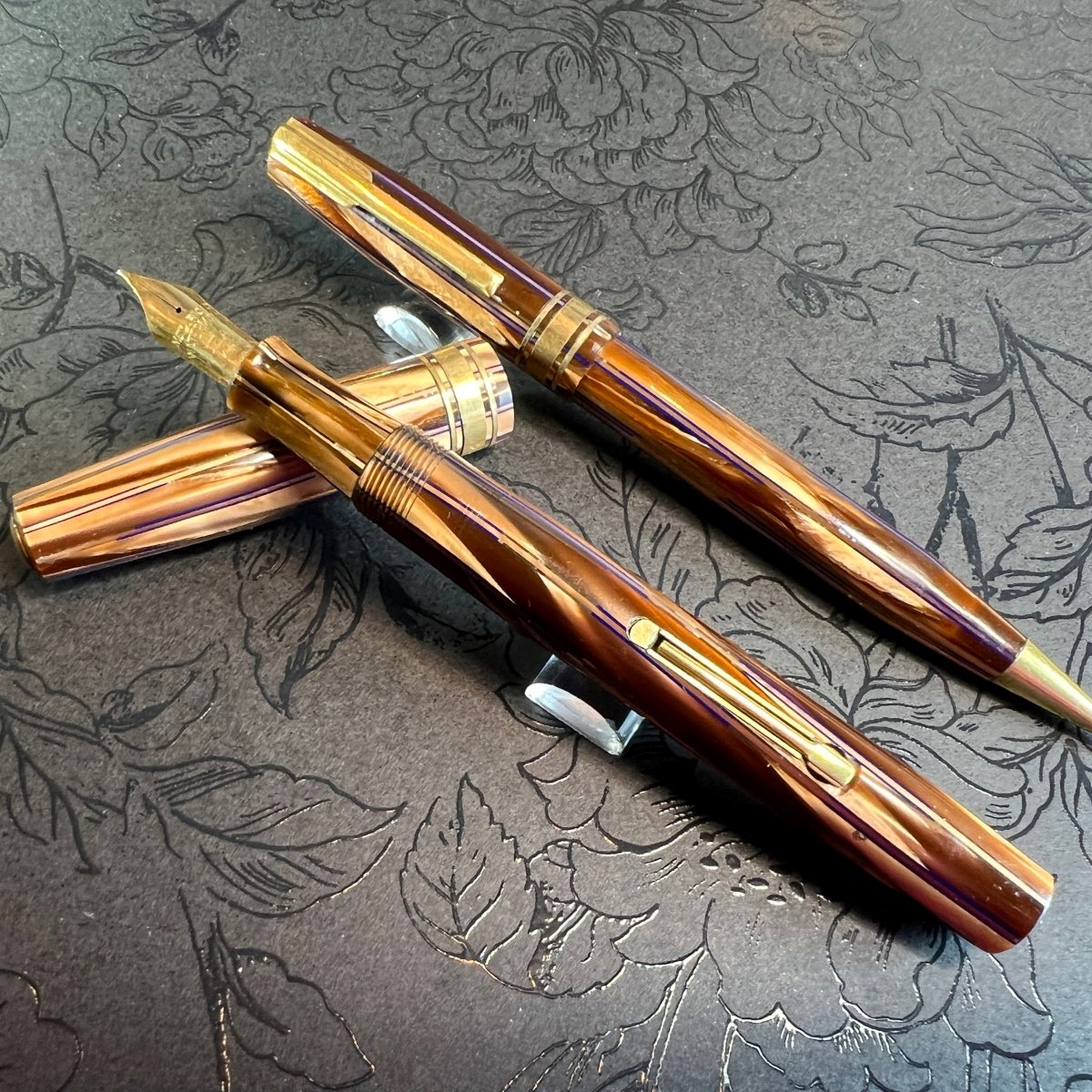 Additional Information: Stunning Golden brown marble with blue and silver inflected stripes. No signs of brassing on either the pen or pencil, but the pen is personalised “A C MEPHAM” 3 banded model, 2 narrow and one broad band with a stepped end as in the “94”